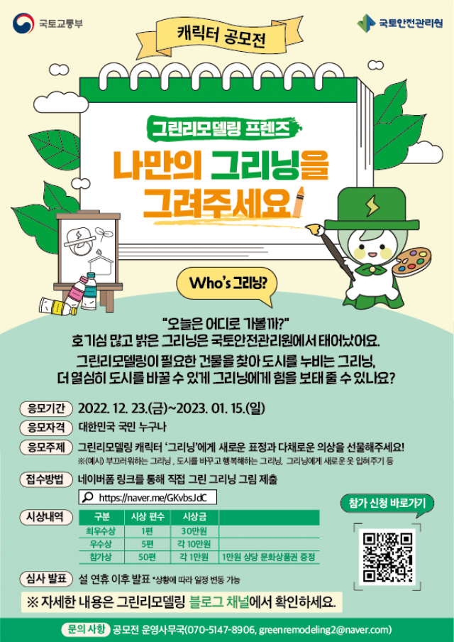 접수중 D-23 조회수 134회 국토안전관리원 그린리모델링 프렌즈 캐릭터 공모전