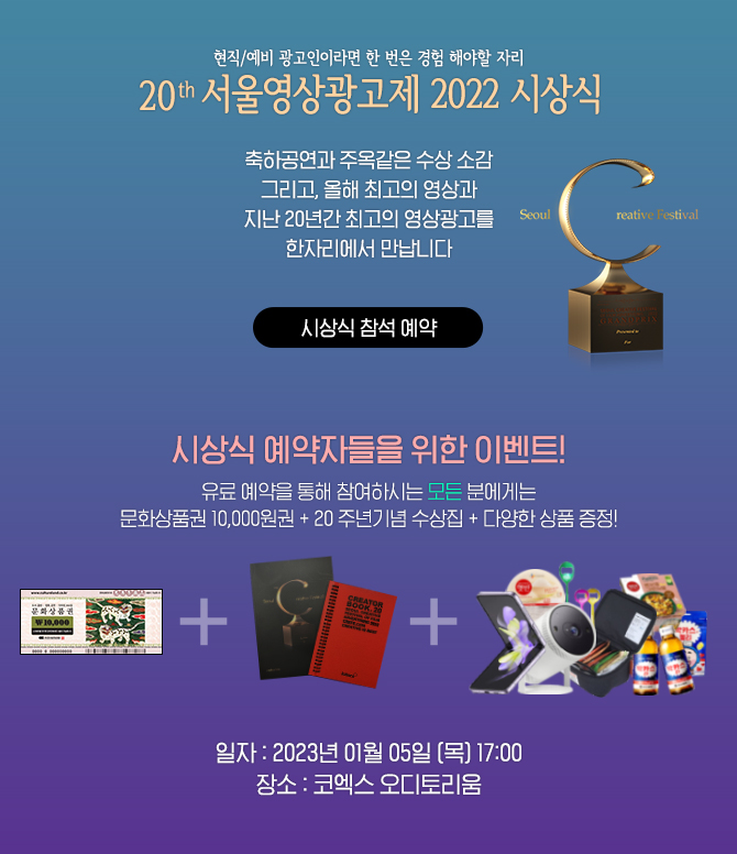 그리고 수상자들의 수상 소감과 함께 시상식 축하공연을 서울영상광고제 2022에서 만나보세요!