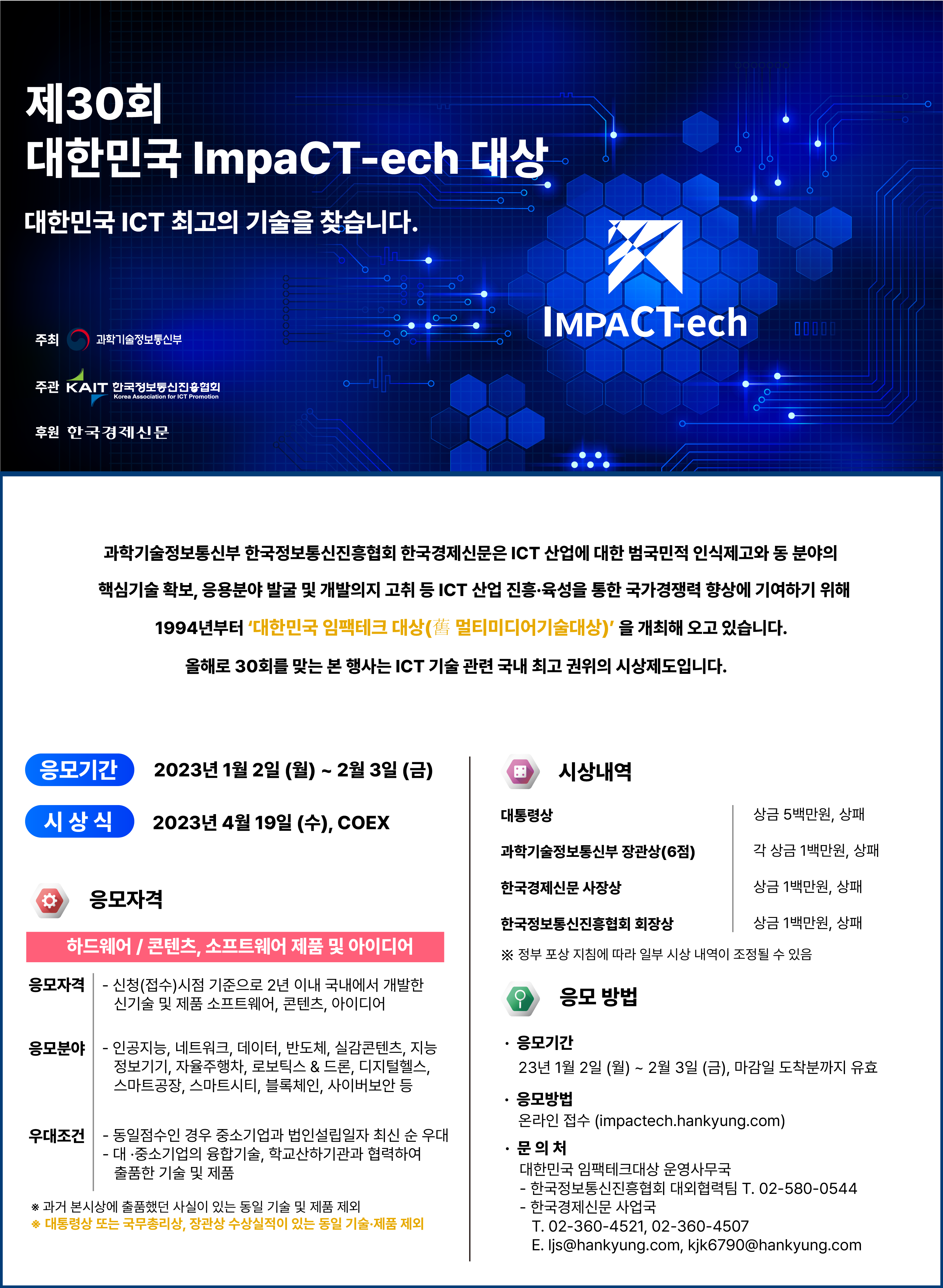 - “제 30회 대한민국 임팩테크 대상”은 ICT 산업에 대한 범국민적 인식제고와 동 분야의 핵심기술 확보,