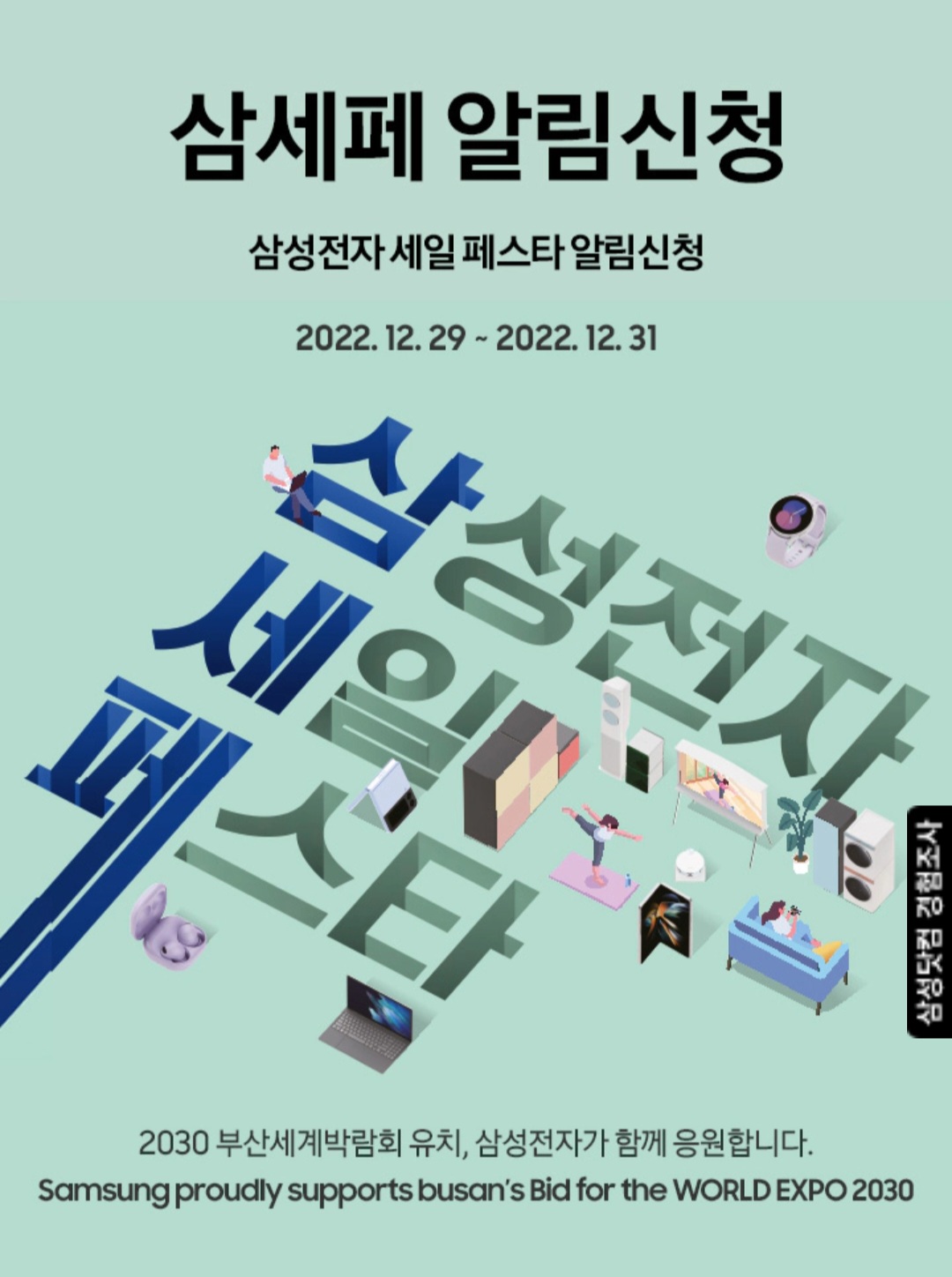 이벤트 문의 : 삼성전자 세일 페스타 운영사무국 02-3485-0814~0818 (평일 09시 ~ 18시 운영 / 점심시간 12-13시 / 토, 일 및 공휴일 휴무)